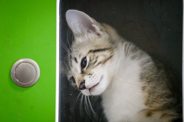 Currently, the cats are housed in the lobby area, which means the adopted dogs must be marched past them.