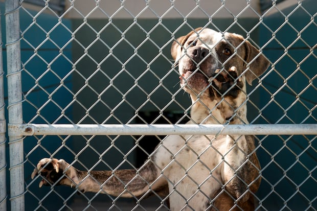 Baristo, an American Staffordshire Terrier, jumps up in front of its cage at the Hillsborough County Pet Resource Center. [ JEFFEREE WOO | Times ]